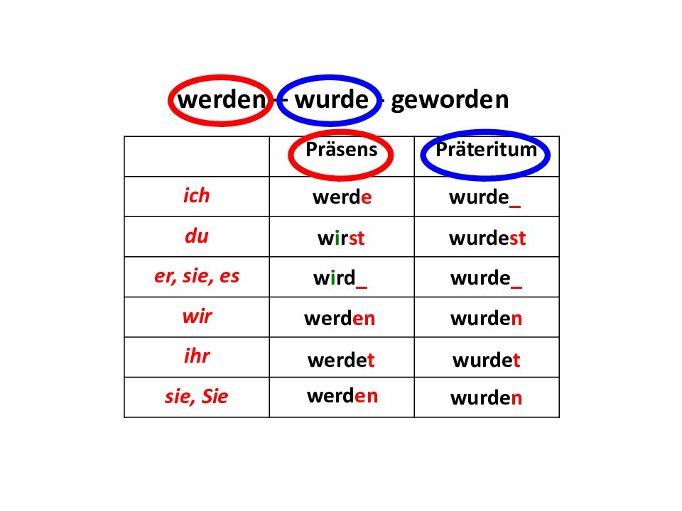 werden – wurde - geworden Präsens Präteritum ich du er, sie, es wir ihr sie, Sie werd e w i r st w i rd _ werd en werde t werd en wurde _ wurde st wurde _ wurde n wurde t wurde n