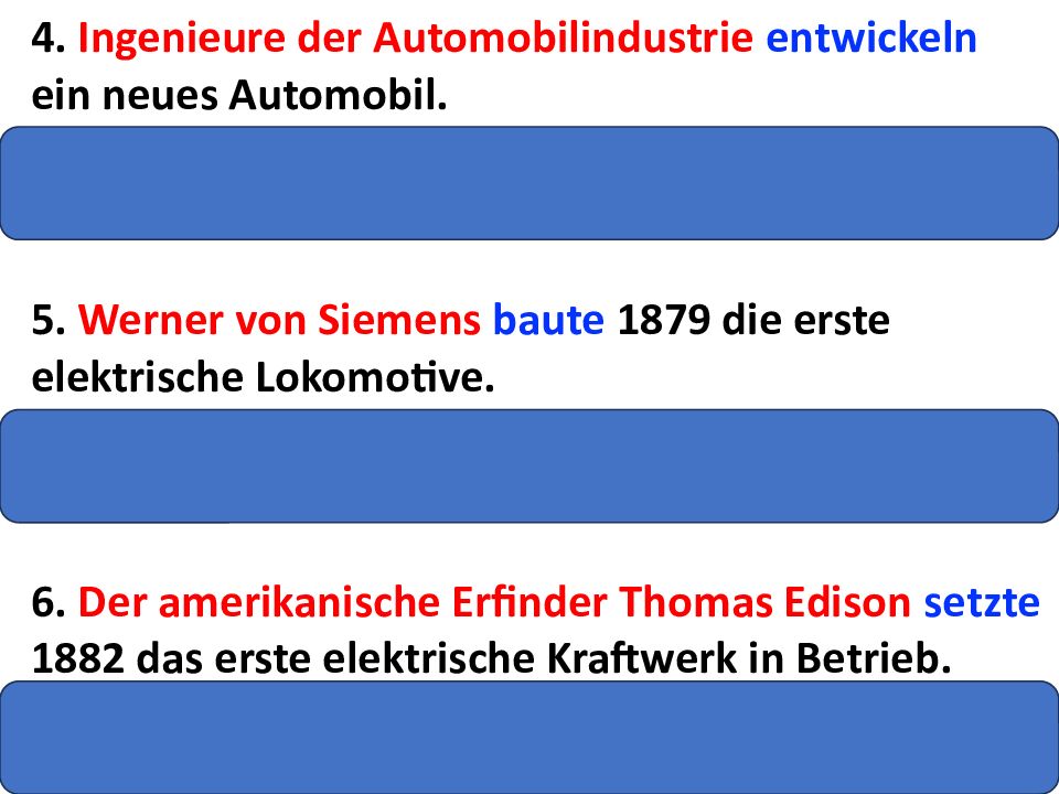 4. Ingenieure der Automobilindustrie entwickeln ein neues Automobil. Ein neues Automobil wird von Ingenieuren der Automobilindustrie entwickelt. 5. Werner von Siemens baute 1879 die erste elektrische Lokomotive. Die erste elektrische Lokomotive wurde 1879 von Werner von Siemens gebaut. 6. Der amerikanische Erfinder Thomas Edison setzte 1882 das erste elektrische Kraftwerk in Betrieb. Das erste elektrische Kraftwerk wurde 1882 vom amerikanischer Erfinder T. Edison in Betrieb gesetzt.