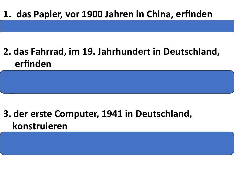 das Papier, vor 1900 Jahren in China, erfinden Das Papier wurde vor 1900 Jahren in China erfunden. 2. das Fahrrad, im 19. Jahrhundert in Deutschland, erfinden Das Fahrrad wurde im 19. Jahrhundert in Deutschland erfunden. 3. der erste Computer, 1941 in Deutschland, konstruieren Der erste Computer wurde 1941 in Deutschland konstruiert.