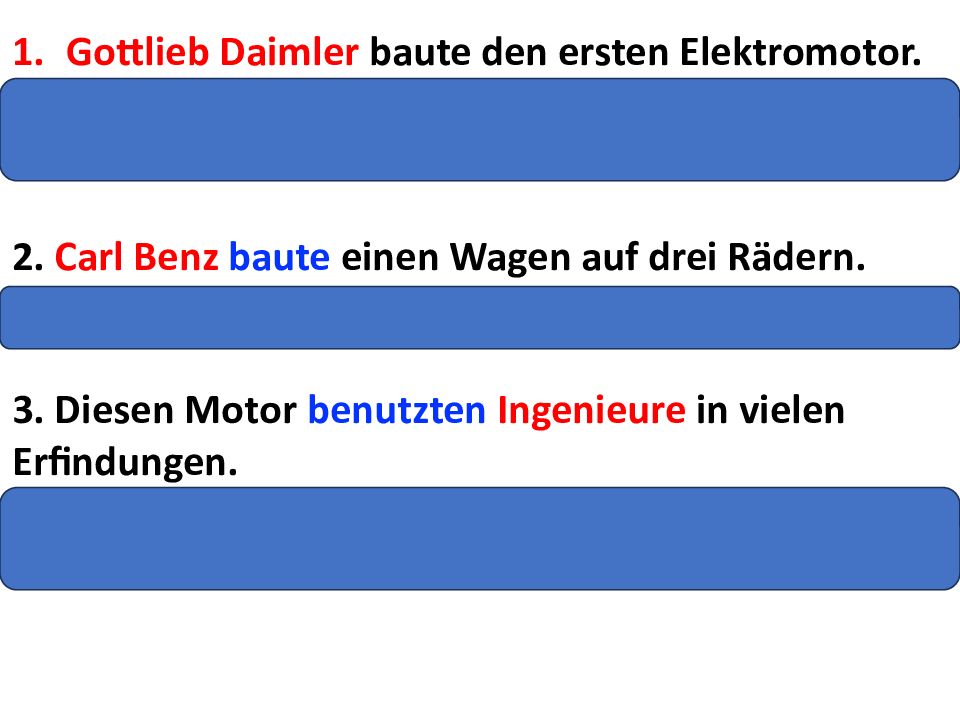 Gottlieb Daimler baute den ersten Elektromotor. Der erste Elektromotor wurde von Gottlieb Daimler gebaut. 2. Carl Benz baute einen Wagen auf drei Rädern. Ein Wagen auf drei Rädern wurde von C. Benz gebaut. 3. Diesen Motor benutzten Ingenieure in vielen Erfindungen. Dieser Motor wurde von Ingenieuren in vielen Erfindungen benutzt.
