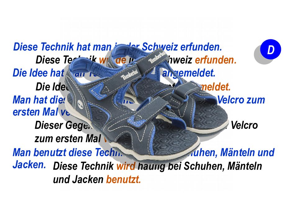 Diese Technik hat man in der Schweiz erfunden. Die Idee hat man 1951 zum Patent angemeldet. Man hat diesen Gegenstand unter dem Namen Velcro zum ersten Mal verkauft. Man benutzt diese Technik häufig bei Schuhen, Mänteln und Jacken. Diese Technik wurde in der Schweiz erfunden. Die Idee wurde 1951 zum Patent angemeldet. Dieser Gegenstand wurde unter dem Namen Velcro zum ersten Mal verkauft. Diese Technik wird häufig bei Schuhen, Mänteln und Jacken benutzt. D