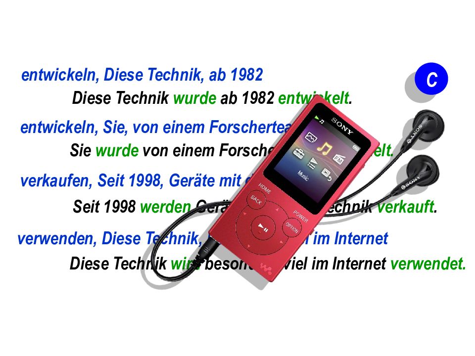 entwickeln, Diese Technik, ab 1982 entwickeln, Sie, von einem Forscherteam verkaufen, Seit 1998, Geräte mit dieser Technik verwenden, Diese Technik, besonders viel im Internet Diese Technik wurde ab 1982 entwickelt. Sie wurde von einem Forscherteam entwickelt. Seit 1998 w e rden Geräte mit dieser Technik verkauft. Diese Technik wird besonders viel im Internet verwendet. C
