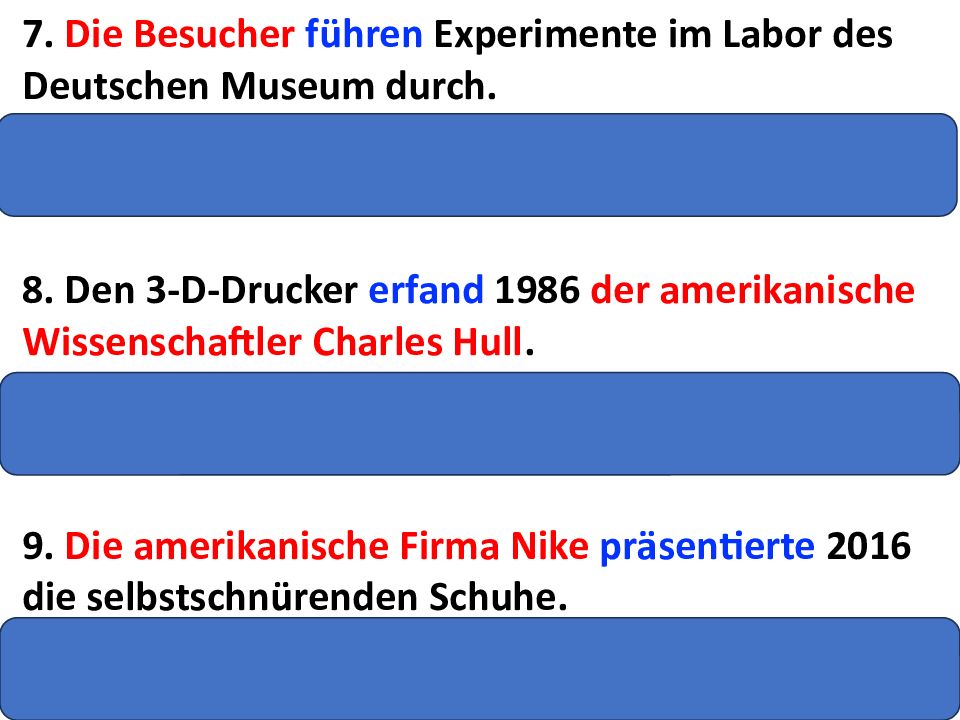 7. Die Besucher führen Experimente im Labor des Deutschen Museum durch. Die Experimente werden von den Besuchern im Labor des Deutschen Museum durchgeführt. 8. Den 3-D-Drucker erfand 1986 der amerikanische Wissenschaftler Charles Hull. Der 3-D-Drucker wurde 1986 vom amerikanischen Wissenschaftler Charles Hull erfunden. 9. Die amerikanische Firma Nike präsentierte 2016 die selbstschnürenden Schuhe. Die selbstschnürenden Schuhe wurden 2016 von der amerikanischen Firma präsentiert.