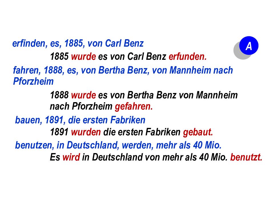 erfinden, es, 1885, von Carl Benz fahren, 1888, es, von Bertha Benz, von Mannheim nach Pforzheim bauen, 1891, die ersten Fabriken benutzen, in Deutschland, werden, mehr als 40 Mio. 1885 wurde es von Carl Benz erfunden. 1888 wurde es von Bertha Benz von Mannheim nach Pforzheim gefahren. 1891 wurden die ersten Fabriken gebaut. Es wird in Deutschland von mehr als 40 Mio. benutzt. A
