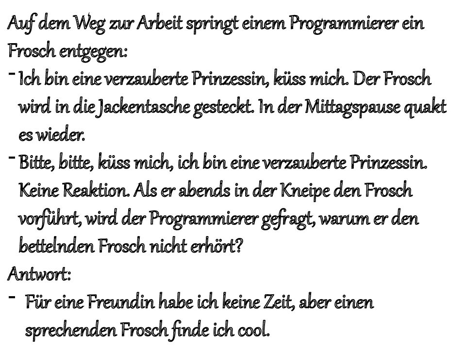 Auf dem Weg zur Arbeit springt einem Programmierer ein Frosch entgegen: Ich bin eine verzauberte Prinzessin, küss mich. Der Frosch wird in die Jackentasche gesteckt. In der Mittagspause quakt es wieder. Bitte, bitte, küss mich, ich bin eine verzauberte Prinzessin. Keine Reaktion. Als er abends in der Kneipe den Frosch vorführt, wird der Programmierer gefragt, warum er den bettelnden Frosch nicht erhört? Antwort: Für eine Freundin habe ich keine Zeit, aber einen sprechenden Frosch finde ich cool.
