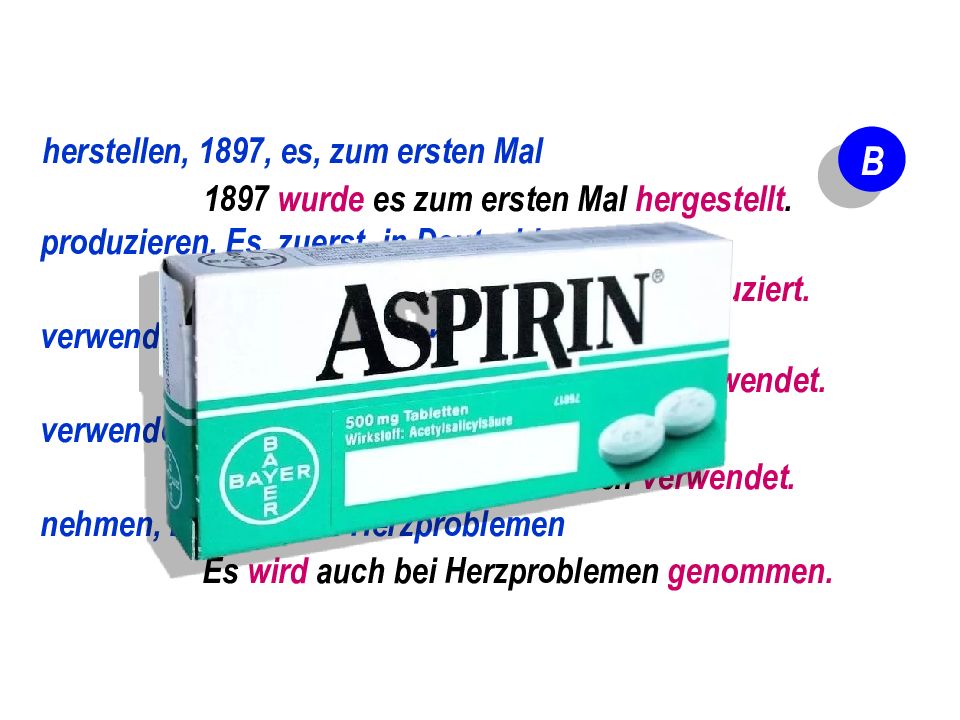 herstellen, 1897, es, zum ersten Mal produzieren, Es, zuerst, in Deutschland verwenden, Heute, es, in der ganzen Welt nehmen, Es, auch bei Herzproblemen verwenden, es, gegen Kopfschmerzen 1897 wurde es zum ersten Mal hergestellt. Es wurde zuerst in Deutschland produziert. Heute wird es in der ganzen Welt verwendet. Es wird gegen Kopfschmerzen verwendet. Es wird auch bei Herzproblemen genommen. B
