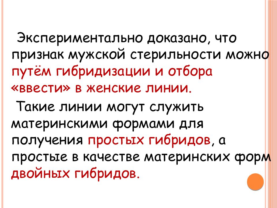 Экспериментально доказано, что признак мужской стерильности можно путём гибридизации и отбора «ввести» в женские линии. Такие линии могут служить материнскими формами для получения простых гибридов, а простые в качестве материнских форм двойных гибридов.