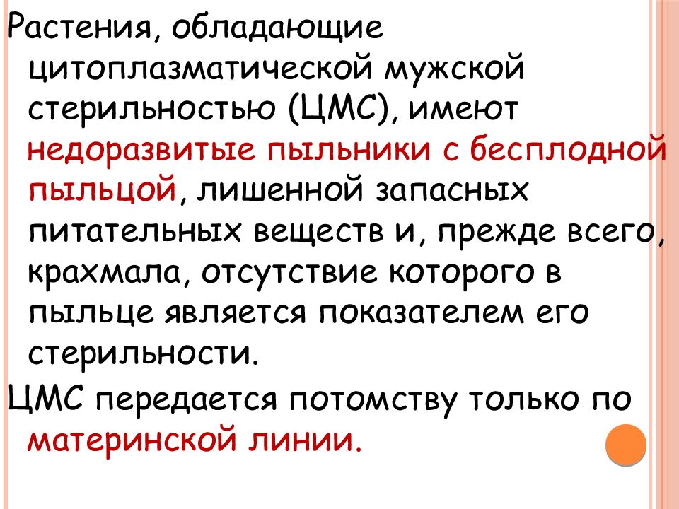 Растения, обладающие цитоплазматической мужской стерильностью (ЦМС), имеют недоразвитые пыльники с бесплодной пыльцой, лишенной запасных питательных веществ и, прежде всего, крахмала, отсутствие которого в пыльце является показателем его стерильности. ЦМС передается потомству только по материнской линии.
