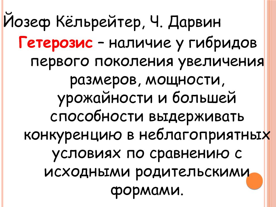 Йозеф Кёльрейтер, Ч. Дарвин Гетерозис – наличие у гибридов первого поколения увеличения размеров, мощности, урожайности и большей способности выдерживать конкуренцию в неблагоприятных условиях по сравнению с исходными родительскими формами.