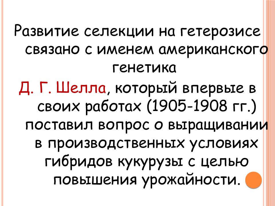 Развитие селекции на гетерозисе связано с именем американского генетика Д. Г. Шелла, который впервые в своих работах (1905-1908 гг.) поставил вопрос о выращивании в производственных условиях гибридов кукурузы с целью повышения урожайности.