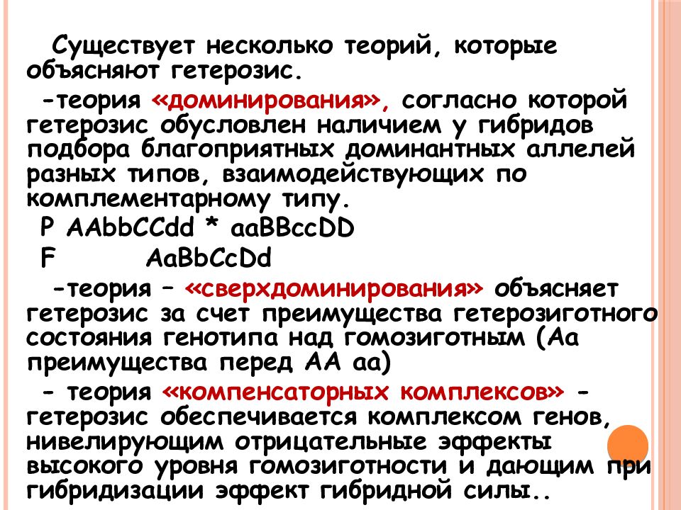 Существует несколько теорий, которые объясняют гетерозис. -теория «доминирования», согласно которой гетерозис обусловлен наличием у гибридов подбора благоприятных доминантных аллелей разных типов, взаимодействующих по комплементарному типу. P AAbbCCdd * aaBBccDD F AaBbCcDd -теория – «сверхдоминирования» объясняет гетерозис за счет преимущества гетерозиготного состояния генотипа над гомозиготным ( Aa преимущества перед АА аа ) - теория «компенсаторных комплексов» - гетерозис обеспечивается комплексом генов, нивелирующим отрицательные эффекты высокого уровня гомозиготности и дающим при гибридизации эффект гибридной силы..