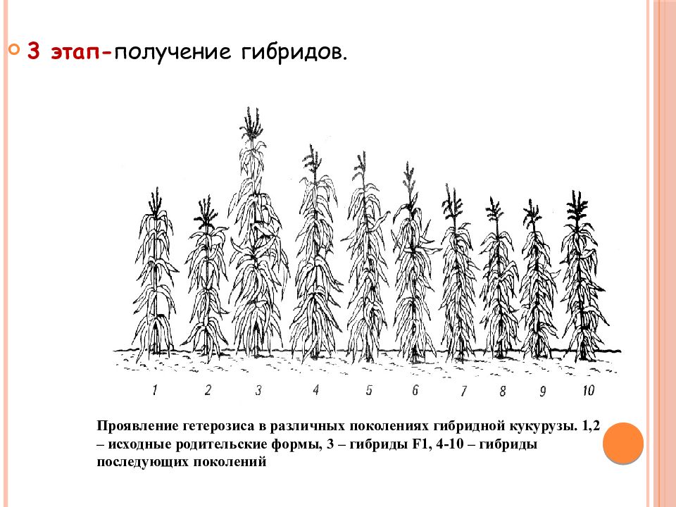 3 этап- получение гибридов. Проявление гетерозиса в различных поколениях гибридной кукурузы. 1,2 – исходные родительские формы, 3 – гибриды F1, 4-10 – гибриды последующих поколений