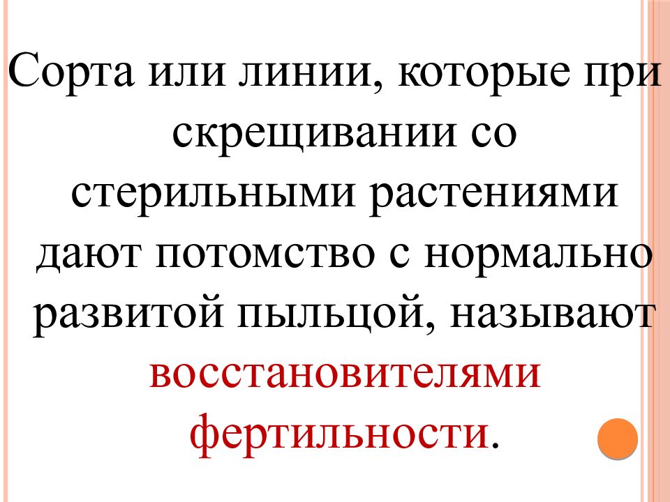 Сорта или линии, которые при скрещивании со стерильными растениями дают потомство с нормально развитой пыльцой, называют восстановителями фертильности.