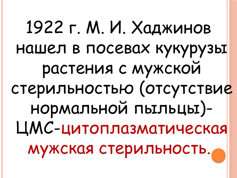 1922 г. М. И. Хаджинов нашел в посевах кукурузы растения с мужской стерильностью (отсутствие нормальной пыльцы)- ЦМС- цитоплазматическая мужская стерильность.