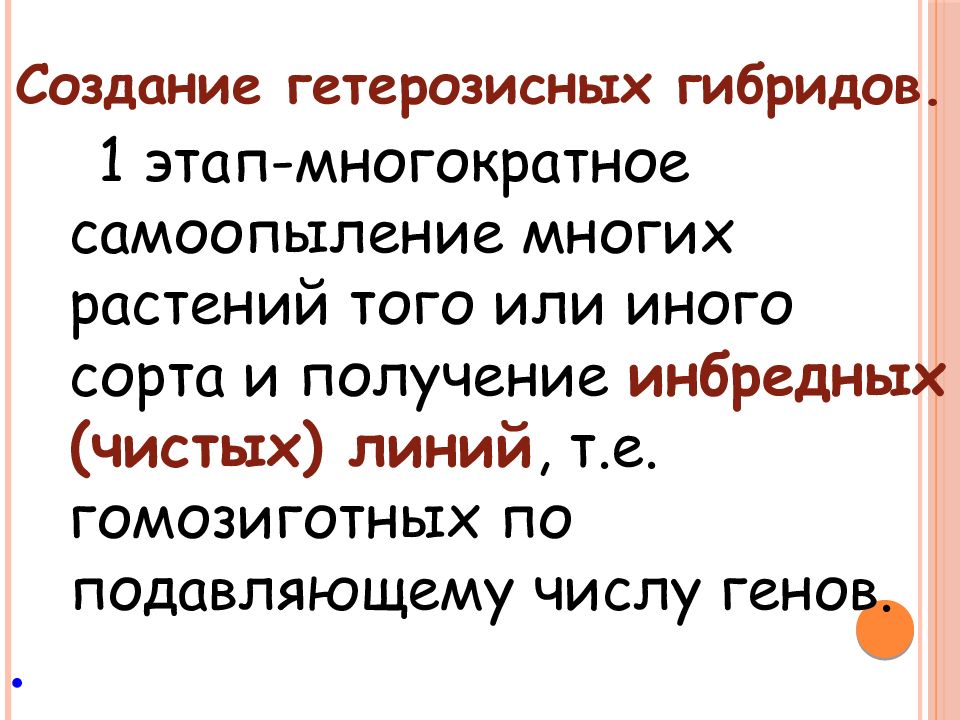 Создание гетерозисных гибридов. 1 этап-многократное самоопыление многих растений того или иного сорта и получение инбредных (чистых) линий, т.е. гомозиготных по подавляющему числу генов. .