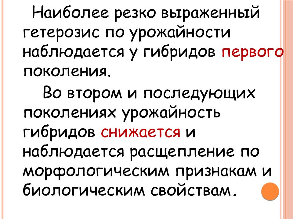 Наиболее резко выраженный гетерозис по урожайности наблюдается у гибридов первого поколения. Во втором и последующих поколениях урожайность гибридов снижается и наблюдается расщепление по морфологическим признакам и биологическим свойствам.