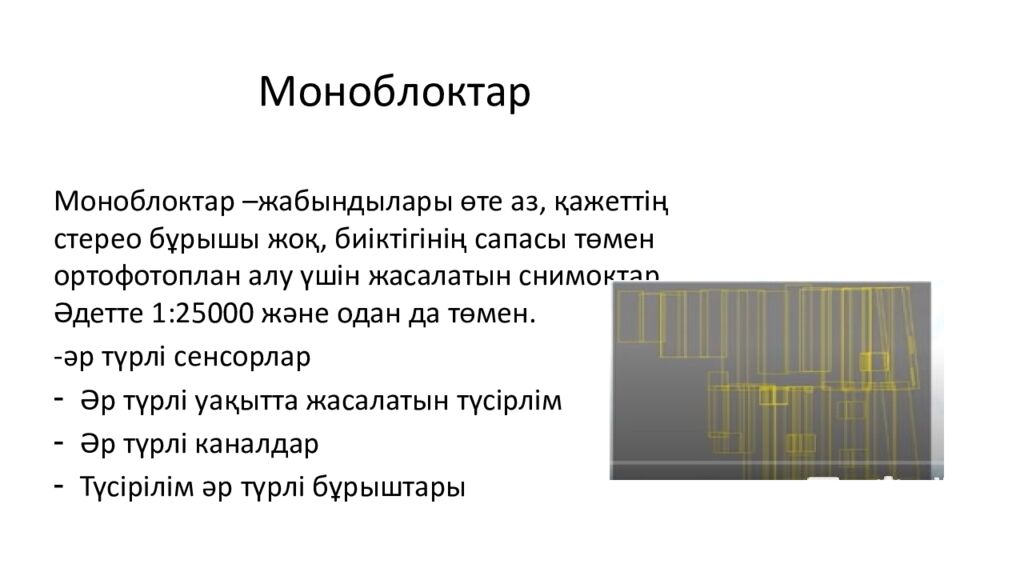 Моноблоктар –жабындылары өте аз, қажеттің стерео бұрышы жоқ, биіктігінің сапасы төмен ортофотоплан алу үшін жасалатын снимоктар. Әдетте 1:25000 және одан да төмен. -әр түрлі сенсорлар Әр түрлі уақытта жасалатын түсірлім Әр түрлі каналдар Түсірілім әр түрлі бұрыштары