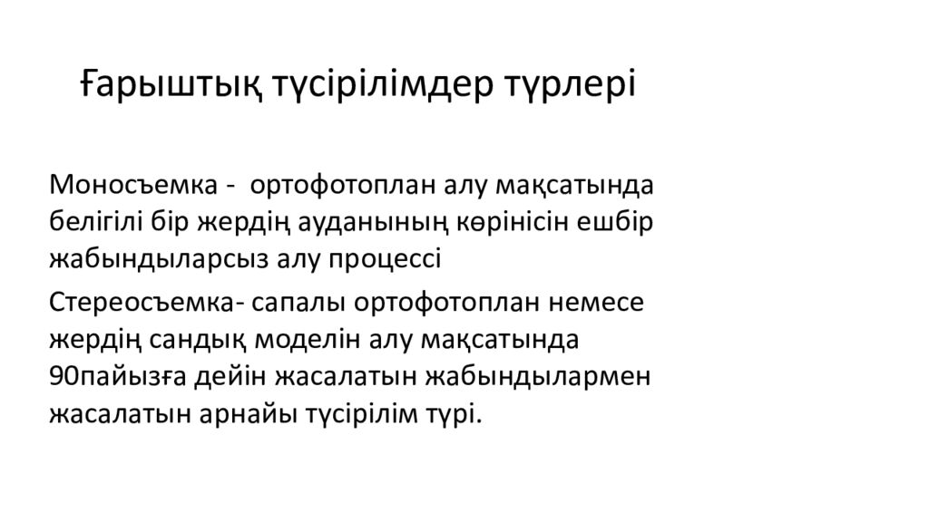 Слайд 3: Ғарыштық түсірілімдер түрлері