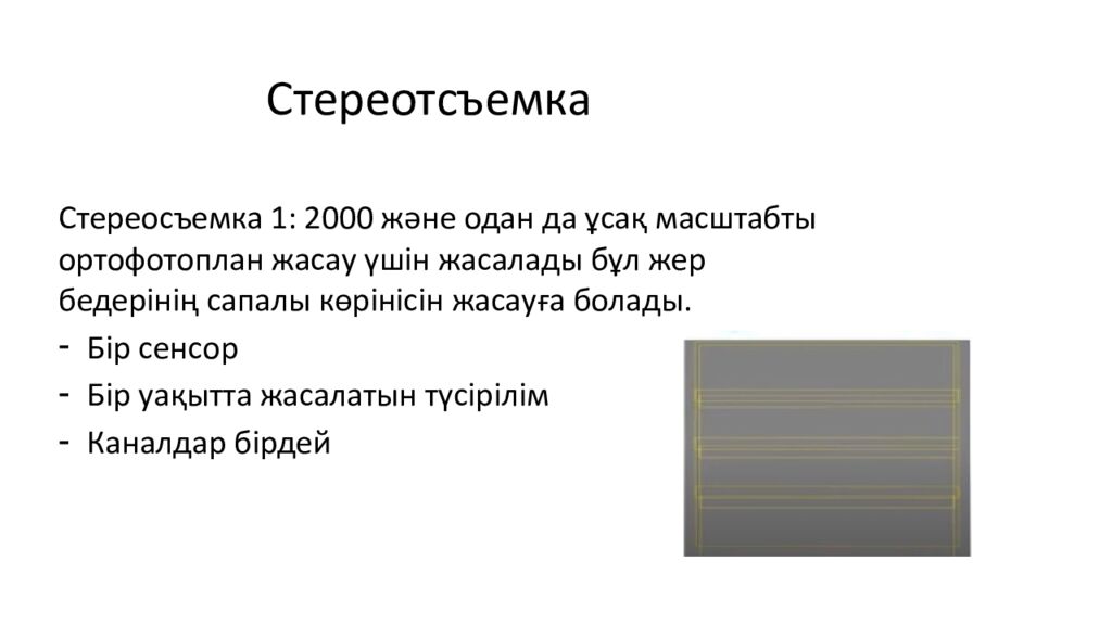 Стереосъемка 1: 2000 және одан да ұсақ масштабты ортофотоплан жасау үшін жасалады бұл жер бедерінің сапалы көрінісін жасауға болады. Бір сенсор Бір уақытта жасалатын түсірілім Каналдар бірдей