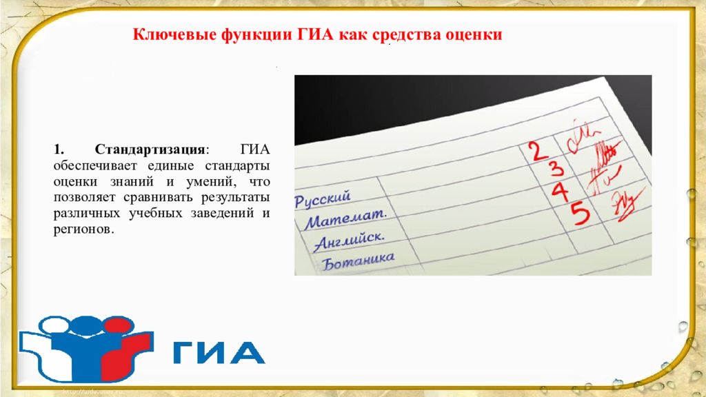 1. Стандартизация : ГИА обеспечивает единые стандарты оценки знаний и умений, что позволяет сравнивать результаты различных учебных заведений и регионов. Ключевые функции ГИА как средства оценки