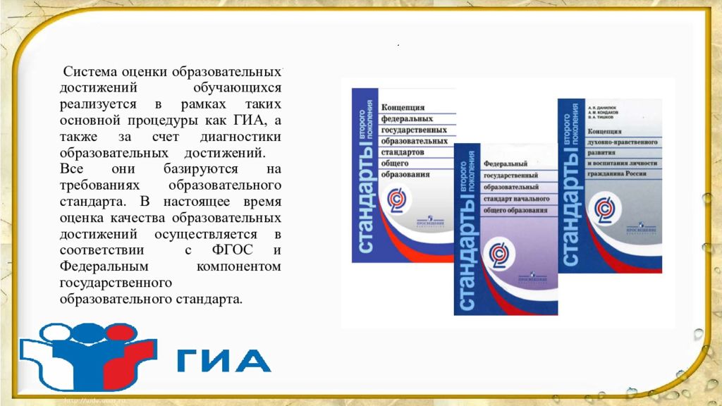 Система оценки образовательных достижений обучающихся реализуется в рамках таких основной процедуры как ГИА, а также за счет диагностики образовательных достижений. Все они базируются на требованиях образовательного стандарта. В настоящее время оценка качества образовательных достижений осуществляется в соответствии с ФГОС и Федеральным компонентом государственного образовательного стандарта.