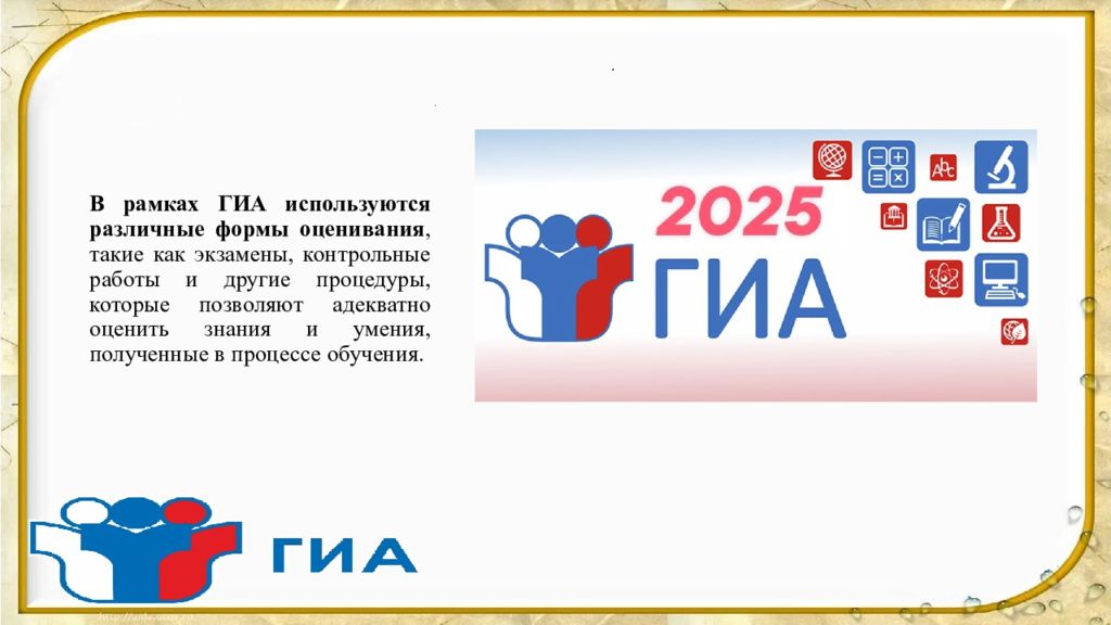 В рамках ГИА используются различные формы оценивания, такие как экзамены, контрольные работы и другие процедуры, которые позволяют адекватно оценить знания и умения, полученные в процессе обучения.