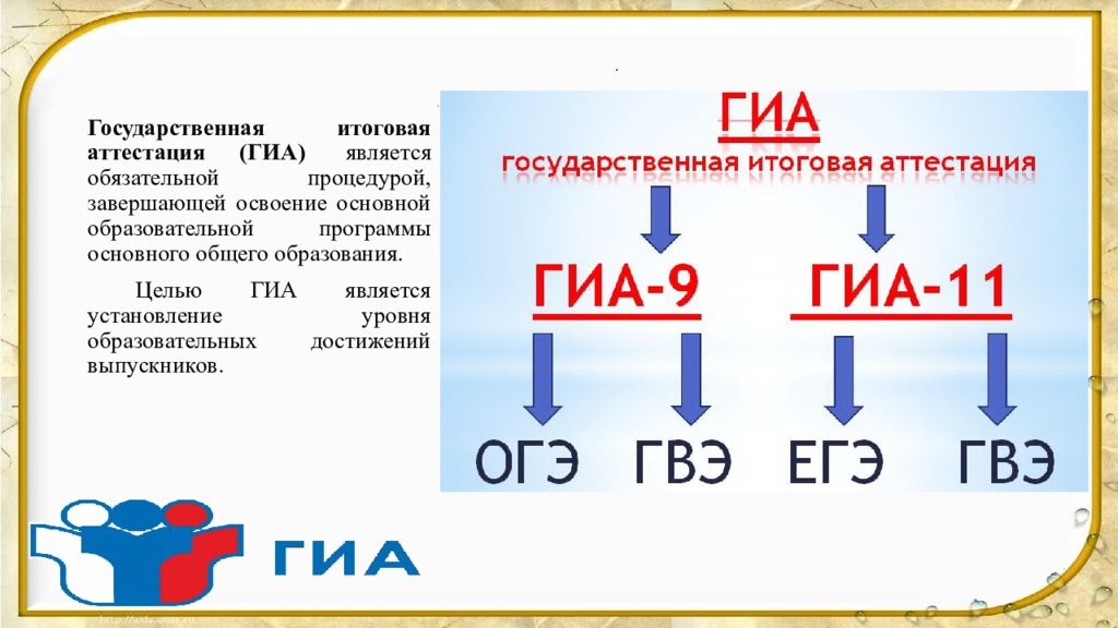 Государственная итоговая аттестация (ГИА) является обязательной процедурой, завершающей освоение основной образовательной программы основного общего образования. Целью ГИА является установление уровня образовательных достижений выпускников.
