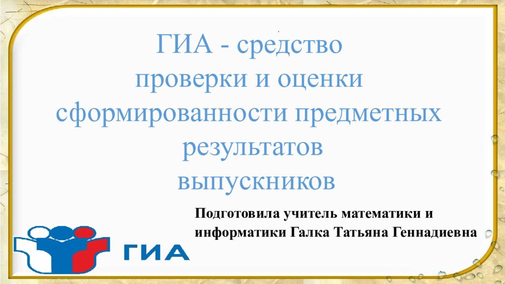 ГИА - средство проверки и оценки сформированности предметных результатов выпускников Подготовила учитель математики и информатики Галка Татьяна Геннадиевна