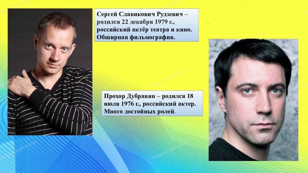 Сергей Славикович Рудзевич – родился 22 декабря 1979 г., российский актёр театра и кино. Обширная фильмография. Прохор Дубравин – родился 18 июля 1976 г., российский актер. Много достойных ролей.