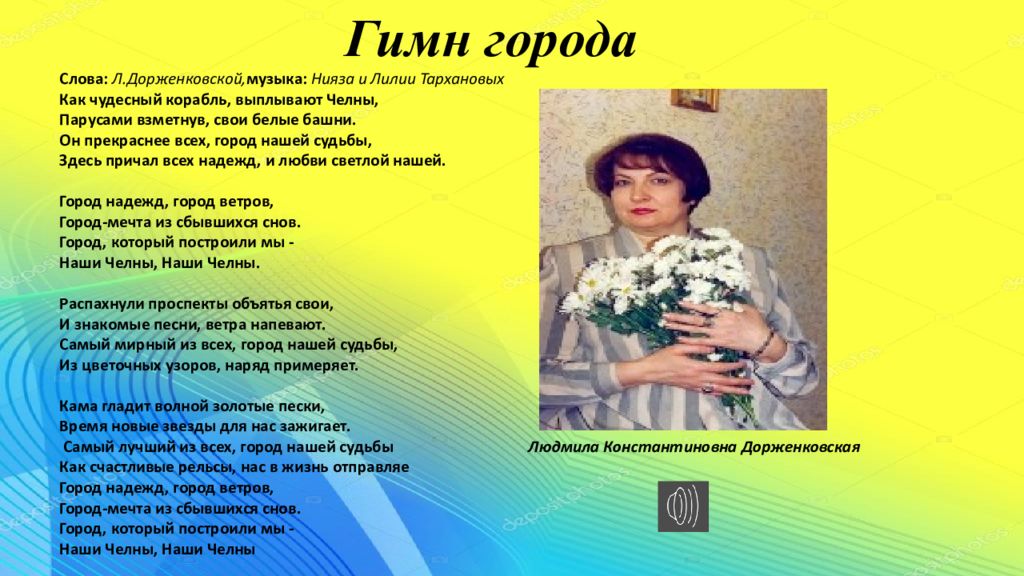 Гимн города Слова: Л.Дорженковской, музыка : Нияза и Лилии Тархановых Как чудесный корабль, выплывают Челны, Парусами взметнув, свои белые башни. Он прекраснее всех, город нашей судьбы, Здесь причал всех надежд, и любви светлой нашей. Город надежд, город ветров, Город-мечта из сбывшихся снов. Город, который построили мы - Наши Челны, Наши Челны. Распахнули проспекты объятья свои, И знакомые песни, ветра напевают. Самый мирный из всех, город нашей судьбы, Из цветочных узоров, наряд примеряет. Кама гладит волной золотые пески, Время новые звезды для нас зажигает. Самый лучший из всех, город нашей судьбы Людмила Константиновна Дорженковская Как счастливые рельсы, нас в жизнь отправляе Город надежд, город ветров, Город-мечта из сбывшихся снов. Город, который построили мы - Наши Челны, Наши Челны