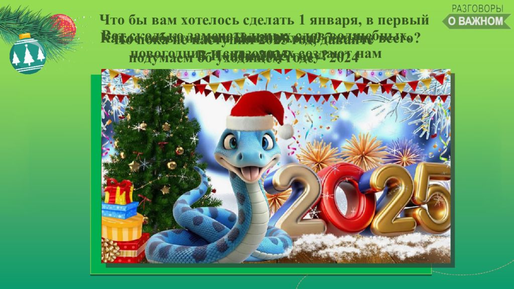 Вот сколько замечательных слов волшебных, новогодних и сказочных создают нам новогоднее настроение Но пока не наступил 2025 год, давайте подумаем об уходящем годе – 2024 Какое событие вам запомнилось больше всего? Почему ? Что бы вам хотелось сделать 1 января, в первый день Нового года? В Новом 2025 году?
