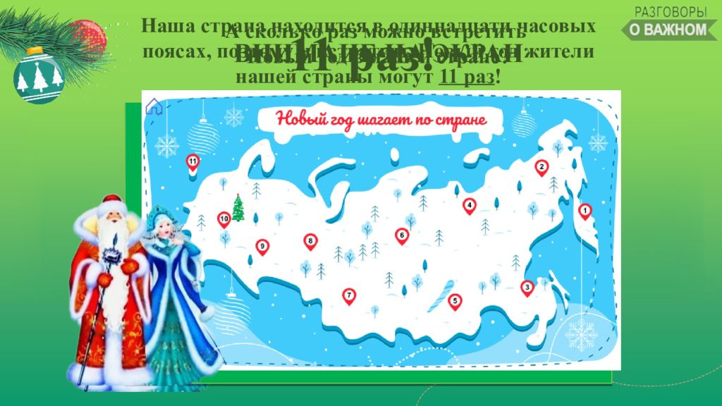 А сколько раз можно встретить Новый год в нашей стране? 11 раз! Наша страна находится в одиннадцати часовых поясах, поэтому и встретить Новый год жители нашей страны могут 11 раз ! ВНИМАИЕ НА ЭКРАН
