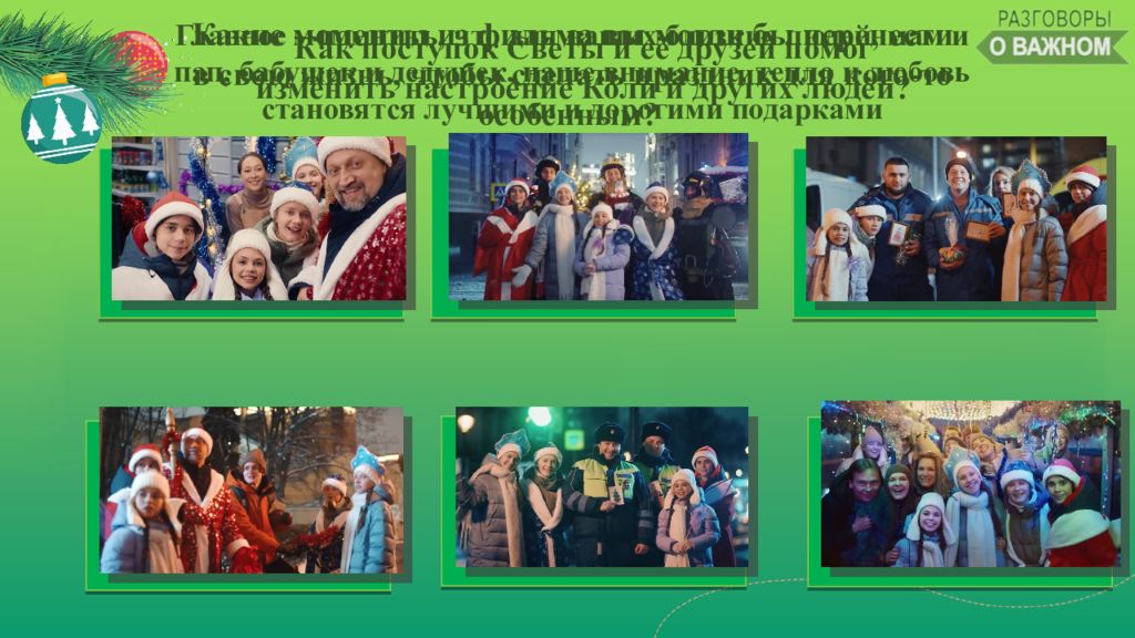 Как поступок Светы и её друзей помог изменить настроение Коли и других людей? Какие моменты из фильма вы могли бы перенести в свою жизнь, чтобы сделать праздник для кого-то особенным? Главное – помнить, что для наших близких людей, мам и пап, бабушек и дедушек, наше внимание, тепло и любовь становятся лучшими и дорогими подарками