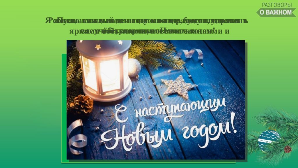Ребята, заканчивая наше занятие, хочу поздравить вас с наступающим Новым годом! Я желаю вам в новом году много радости, успехов в учёбе, здоровья и счастья. Пусть каждый день нового года будет наполнен яркими событиями, новыми знаниями и открытиями