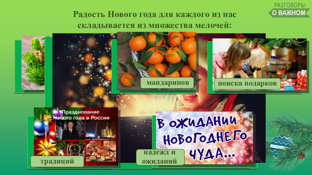 Радость Нового года для каждого из нас складывается из множества мелочей: запаха хвои мандаринов поиска подарков традиций надежд и ожиданий