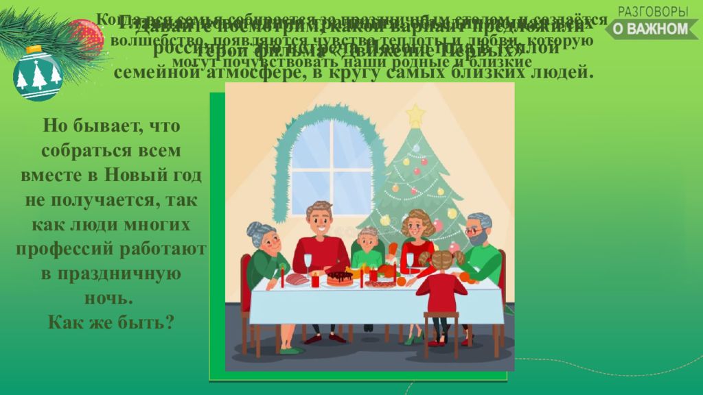 Главная новогодняя традиция, объединяющая всех россиян, – это встреча Нового года в тёплой семейной атмосфере, в кругу самых близких людей. Когда вся семья собирается за праздничным столом, и создаётся волшебство, появляются чувства теплоты и любви, которую могут почувствовать наши родные и близкие Но бывает, что собраться всем вместе в Новый год не получается, так как люди многих профессий работают в праздничную ночь. Как же быть? Давайте посмотрим, какой вариант предложили герои фильма «Движение Первых»