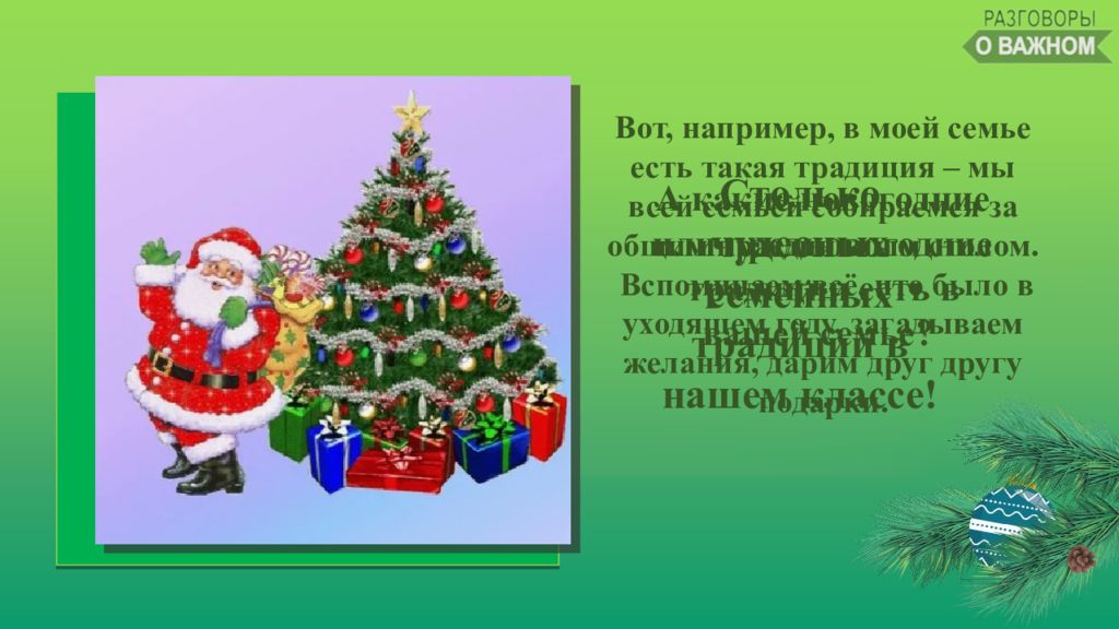 Вот, например, в моей семье есть такая традиция – мы всей семьёй собираемся за общим праздничным столом. Вспоминаем всё, что было в уходящем году, загадываем желания, дарим друг другу подарки. А какие новогодние или предновогодние традиции есть в вашей семье? Столько чудесных семейных традиций в нашем классе!