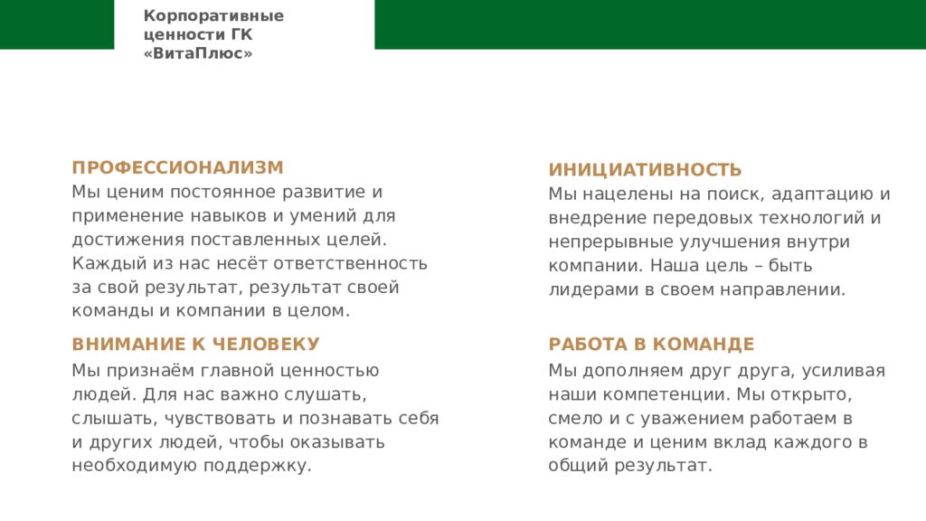 Корпоративные ценности ГК « ВитаПлюс » Мы ценим постоянное развитие и применение навыков и умений для достижения поставленных целей. Каждый из нас несёт ответственность за свой результат, результат своей команды и компании в целом. Мы нацелены на поиск, адаптацию и внедрение передовых технологий и непрерывные улучшения внутри компании. Наша цель – быть лидерами в своем направлении. Мы признаём главной ценностью людей. Для нас важно слушать, слышать, чувствовать и познавать себя и других людей, чтобы оказывать необходимую поддержку. Мы дополняем друг друга, усиливая наши компетенции. Мы открыто, смело и с уважением работаем в команде и ценим вклад каждого в общий результат. ПРОФЕССИОНАЛИЗМ ИНИЦИАТИВНОСТЬ ВНИМАНИЕ К ЧЕЛОВЕКУ РАБОТА В КОМАНДЕ