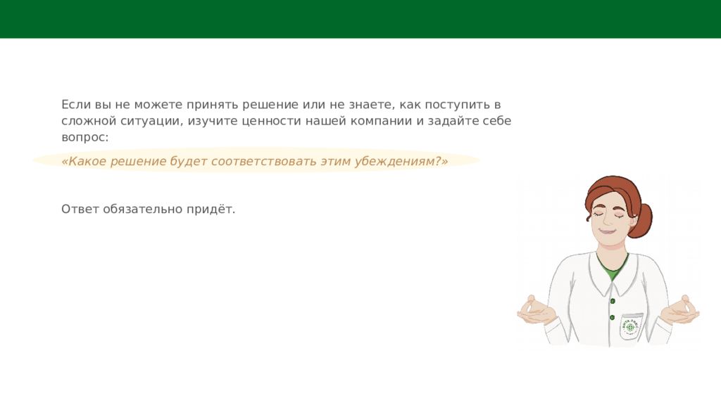 Если вы не можете принять решение или не знаете, как поступить в сложной ситуации, изучите ценности нашей компании и задайте себе вопрос: «Какое решение будет соответствовать этим убеждениям?» Ответ обязательно придёт.