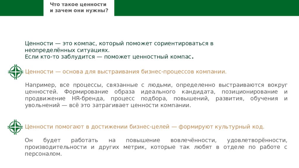 Что такое ценности и зачем они нужны? Ценности — основа для выстраивания бизнес-процессов компании. Например, все процессы, связанные с людьми, определенно выстраиваются вокруг ценностей. Формирование образа идеального кандидата, позиционирование и продвижение HR-бренда, процесс подбора, повышений, развития, обучения и увольнений — всё это затрагивает ценности компании. Ценности помогают в достижении бизнес-целей — формируют культурный код. Он будет работать на повышение вовлечённости, удовлетворённости, производительности и других метрик, которые так любят в отделе по работе с персоналом. Ц енности — это компас, который поможет сориентироваться в неопределённых ситуациях. Если кто-то заблудится — поможет ценностный компас.