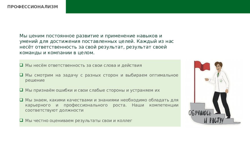 ПРОФЕССИОНАЛИЗМ Мы ценим постоянное развитие и применение навыков и умений для достижения поставленных целей. Каждый из нас несёт ответственность за свой результат, результат своей команды и компании в целом. Мы несём ответственность за свои слова и действия Мы смотрим на задачу с разных сторон и выбираем оптимальное решение Мы признаём ошибки и свои слабые стороны и устраняем их Мы знаем, какими качествами и знаниями необходимо обладать для карьерного и профессионального роста. Наши компетенции соответствуют должности Мы честно оцениваем результаты свои и коллег