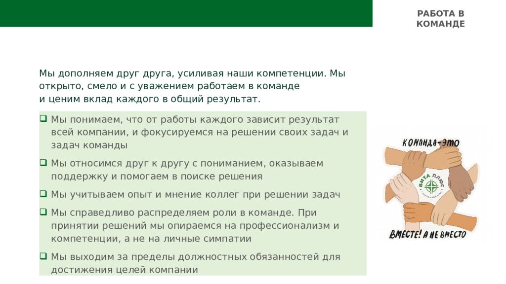 РАБОТА В КОМАНДЕ Мы дополняем друг друга, усиливая наши компетенции. Мы открыто, смело и с уважением работаем в команде и ценим вклад каждого в общий результат. Мы понимаем, что от работы каждого зависит результат всей компании, и фокусируемся на решении своих задач и задач команды Мы относимся друг к другу с пониманием, оказываем поддержку и помогаем в поиске решения Мы учитываем опыт и мнение коллег при решении задач Мы справедливо распределяем роли в команде. При принятии решений мы опираемся на профессионализм и компетенции, а не на личные симпатии Мы выходим за пределы должностных обязанностей для достижения целей компании