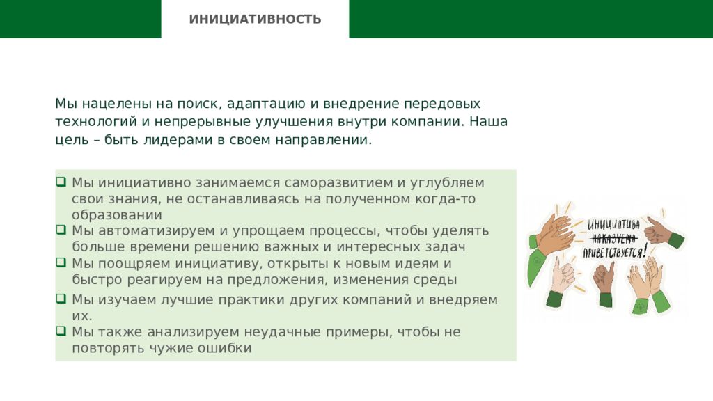 ИНИЦИАТИВНОСТЬ Мы нацелены на поиск, адаптацию и внедрение передовых технологий и непрерывные улучшения внутри компании. Наша цель – быть лидерами в своем направлении. Мы инициативно занимаемся саморазвитием и углубляем свои знания, не останавливаясь на полученном когда-то образовании Мы автоматизируем и упрощаем процессы, чтобы уделять больше времени решению важных и интересных задач Мы поощряем инициативу, открыты к новым идеям и быстро реагируем на предложения, изменения среды Мы изучаем лучшие практики других компаний и внедряем их. Мы также анализируем неудачные примеры, чтобы не повторять чужие ошибки