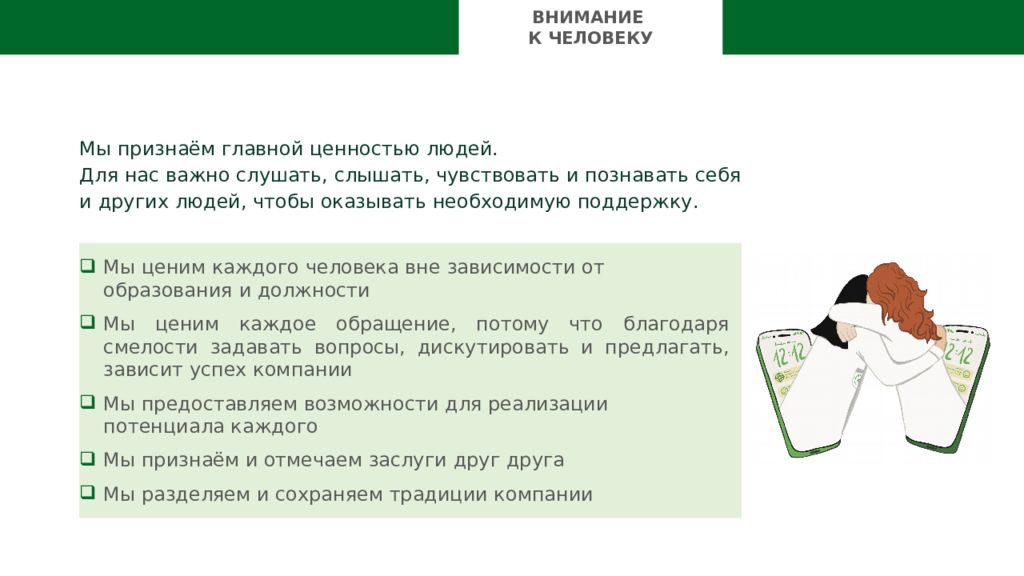 Мы признаём главной ценностью людей. Для нас важно слушать, слышать, чувствовать и познавать себя и других людей, чтобы оказывать необходимую поддержку. Мы ценим каждого человека вне зависимости от образования и должности Мы ценим каждое обращение, потому что благодаря смелости задавать вопросы, дискутировать и предлагать, зависит успех компании Мы предоставляем возможности для реализации потенциала каждого Мы признаём и отмечаем заслуги друг друга Мы разделяем и сохраняем традиции компании ВНИМАНИЕ К ЧЕЛОВЕКУ