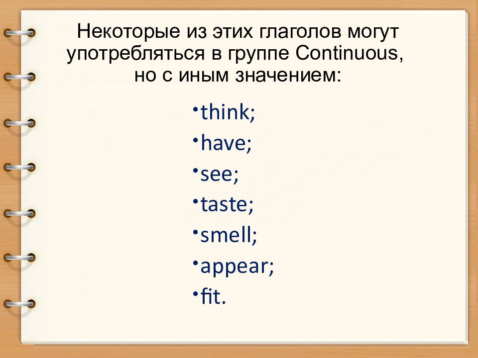 глаголы восприятия ( appear, hear, seem, see, smell, sound, taste) ; глаголы мыслительной деятельности ( believe, forget, know, realise, remember, understand ); глаголы, выражающие чувства и эмоции ( desire, enjoy, hate, like, love, prefer, want) ; некоторые другие глаголы ( be, belong, contain, cost, fit, have, include, matter, need, own, wish).