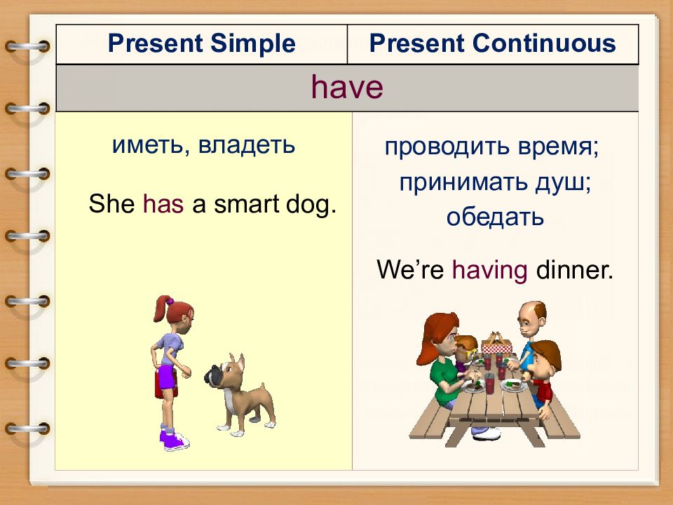иметь, владеть She has a smart dog. проводить время; принимать душ; обедать We’re having dinner. Present Simple Present Continuous have
