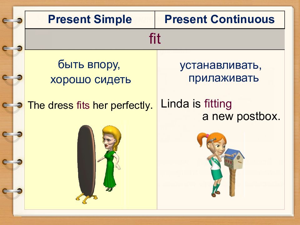 быть впору, хорошо сидеть The dress fits her perfectly. устанавливать, прилаживать Linda is fitting a new postbox. Present Simple Present Continuous fit