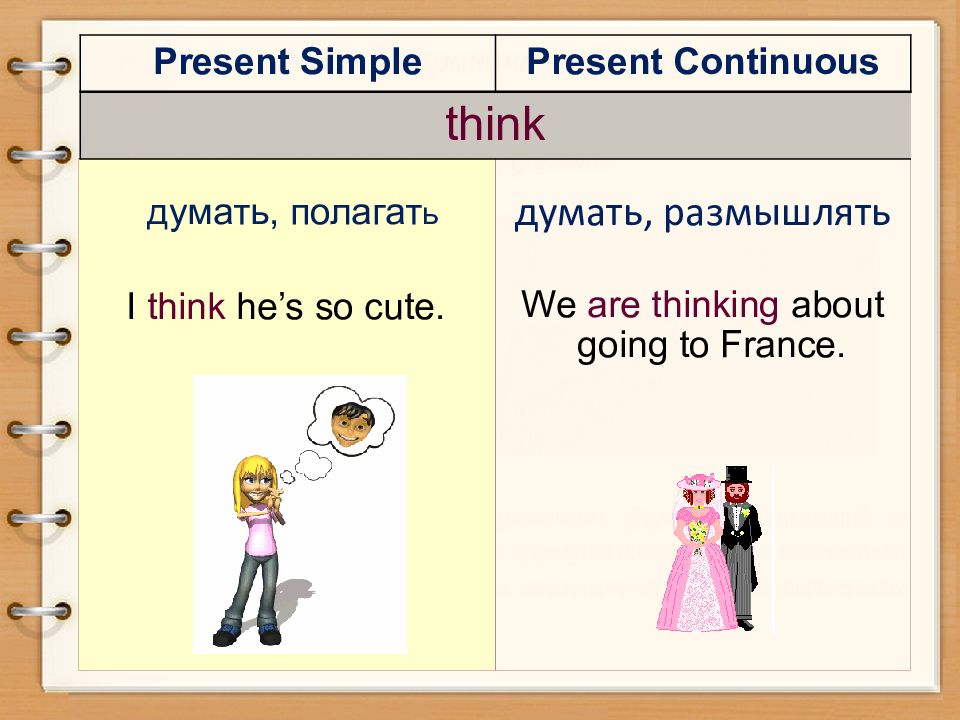 думать, полагат ь I think he’s so cute. думать, размышлять We are thinking about going to France. Present Simple Present Continuous think