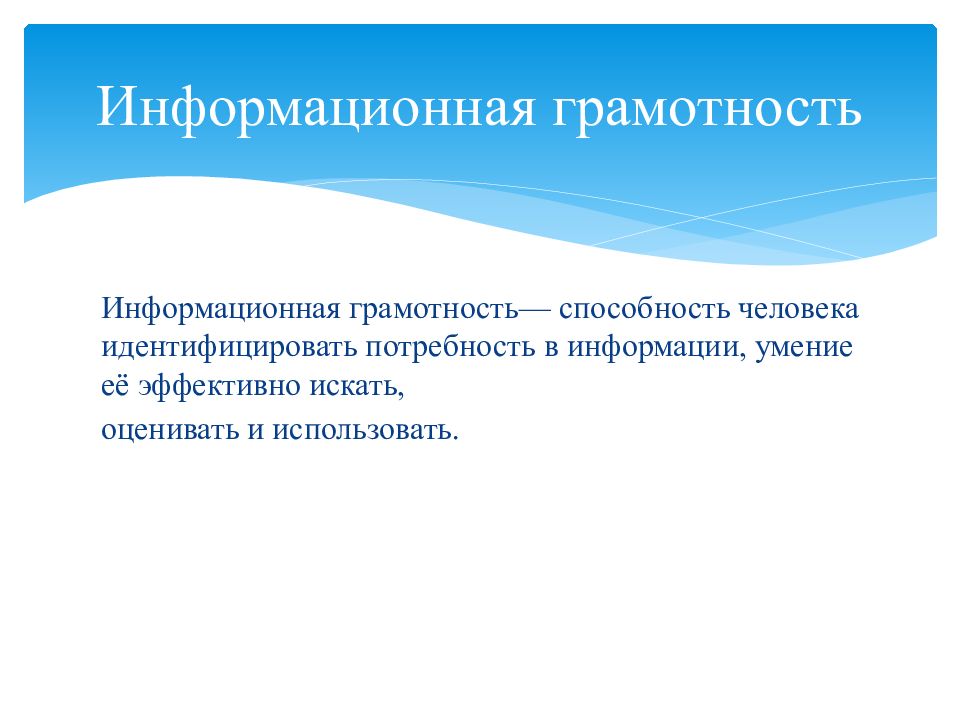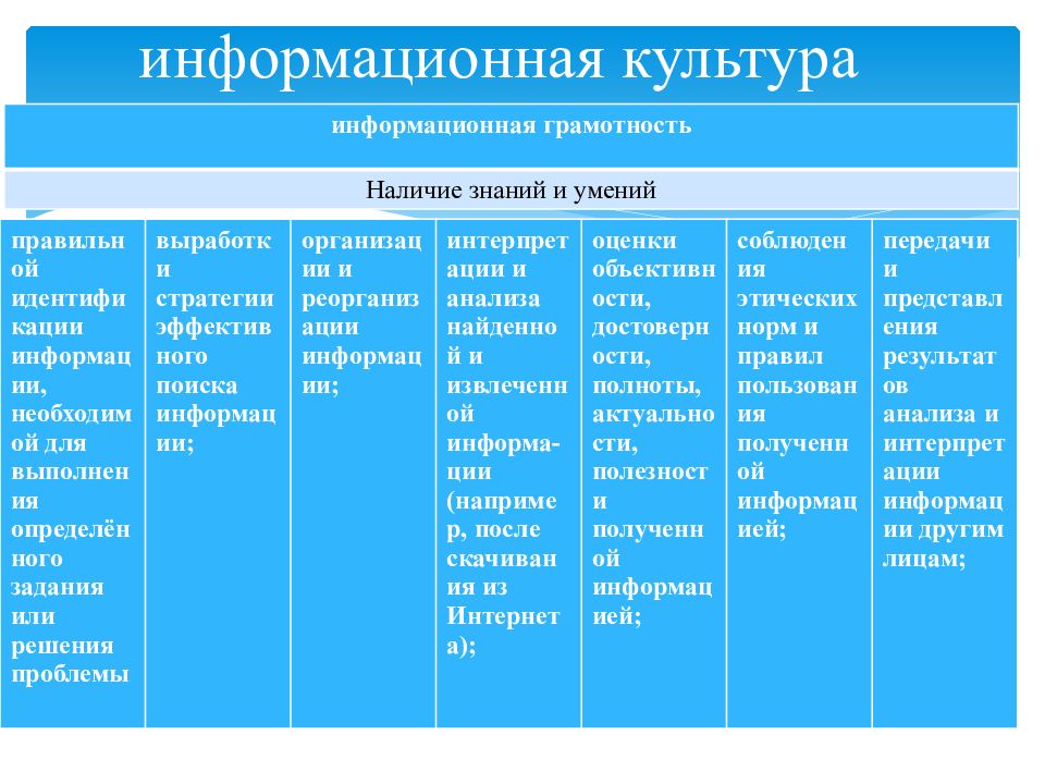правильной идентификации информации, необходимой для выполнения определённого задания или решения проблемы выработки стратегии эффективного поиска информации; организации и реорганизации информации; интерпретации и анализа найденной и извлеченной информа - ции (например, после скачивания из Интернета); оценки объективности, достоверности, полноты, актуальности, полезности полученной информацией; соблюдения этических норм и правил пользования полученной информацией; передачи и представления результатов анализа и интерпретации информации другим лицам; информационная грамотность Наличие знаний и умений