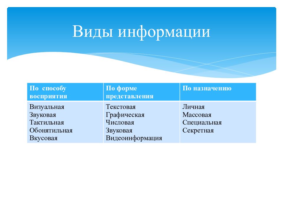 По способу восприятия По форме представления По назначению Визуальная Звуковая Тактильная Обонятильная Вкусовая Текстовая Графическая Числовая Звуковая Видеоинформация Личная Массовая Специальная Секретная Виды информации